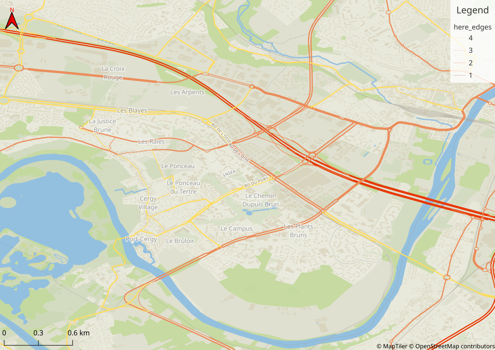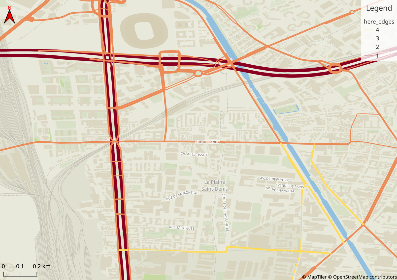 • Roads with functional class 1 to 4 are selected (i.e., less important roads are removed)